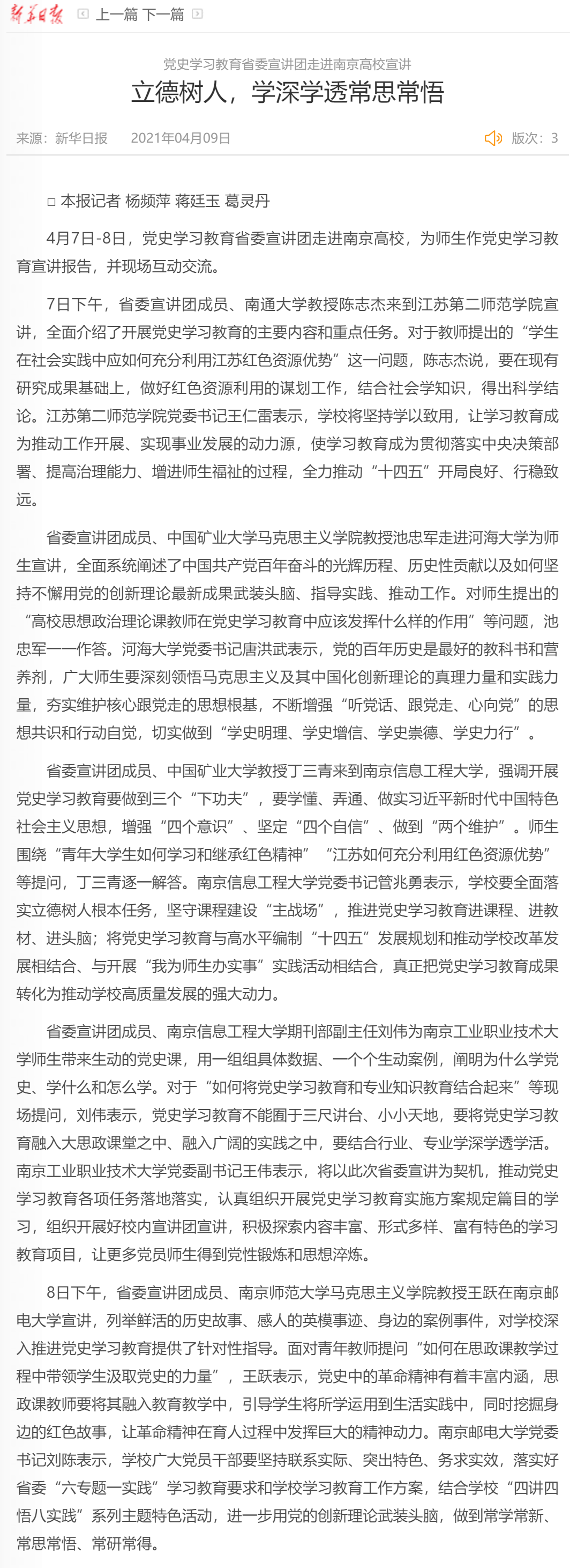 | 【新華日報】黨史學習教育省委宣講團走進南京高校宣講 立德樹人,學深學透常思常悟 |