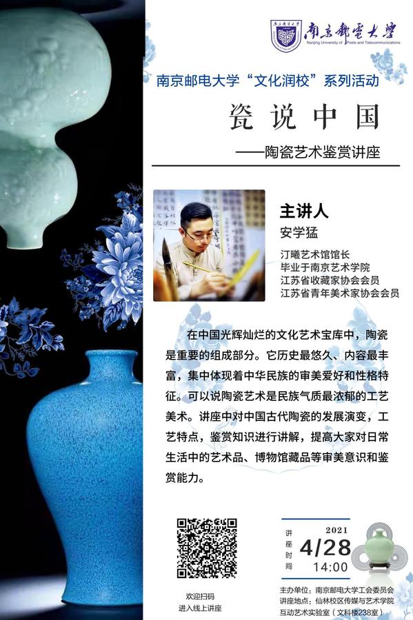 校工會將于2021年4月28日14:00,舉行“瓷說中國——陶瓷藝術鑒賞講座”。 歡迎收看。直播網址:http://play.yunxi.tv/pages/f82bee50146d4581b1421ae6860b8f17