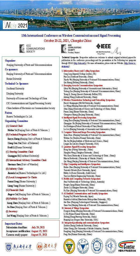 由南京郵電大學(xué)主辦,湖南大學(xué)承辦,中國科學(xué)技術(shù)大學(xué)、浙江大學(xué)、東南大學(xué)、中國通信學(xué)會(huì)通信理論與信號(hào)處理專委會(huì)和中國電子學(xué)會(huì)通信分會(huì)共同協(xié)辦的第十三屆國際無線通信與信號(hào)處理大會(huì)(WCSP 2021)將于2021年10月20日至22日在湖南省長(zhǎng)沙市舉辦。本次會(huì)議將邀請(qǐng)信息通信領(lǐng)域知名專家學(xué)者,圍繞前沿理論與技術(shù)發(fā)展進(jìn)行交流和分享。大會(huì)期間,中國通信學(xué)會(huì)通信理論與信號(hào)處理專委會(huì)將舉辦“面向6G的通信網(wǎng)絡(luò)愿景、技術(shù)與挑戰(zhàn)”論壇。大會(huì)現(xiàn)公開征集論文,歡迎各位老師踴躍投稿,并將有關(guān)事項(xiàng)通知如下。 一、征文范圍(包括但不限于) 信息論與編碼 新興通信領(lǐng)域 無線傳輸與組網(wǎng) 智能信號(hào)處理 計(jì)算機(jī)視覺與圖像處理 量子信號(hào)處理 邊緣計(jì)算與智能 移動(dòng)網(wǎng)絡(luò)與計(jì)算 智能通信與安全 物聯(lián)網(wǎng) 感知通信一體化 二、投稿須知 請(qǐng)登錄EDAS系統(tǒng)進(jìn)行投稿,論文要求不超過雙欄5頁,符合IEEE會(huì)議論文模版要求。 截稿日期:7月20日 錄用通知:8月15日 終版提交:8月31日 會(huì)議日期:10月20-22日 三、論文出版 經(jīng)審稿錄用的稿件,將收錄至大會(huì)論文集。大會(huì)論文集將被IEEE Xplore全文收錄并被EI檢索。 英文版征文通知見附件。更多征文詳情參見大會(huì)官網(wǎng):http://www.ic-wcsp.org 附件:CALL FOR PAPERS(WCSP 2021)