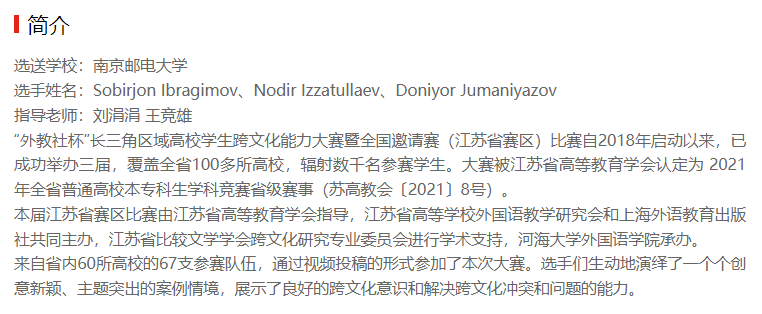 | 【學習強國江蘇學習平臺】第四屆“外教社杯”長三角區域高校學生跨文化能力大賽暨全國邀請賽(江蘇省賽區)優秀作品展示 |
