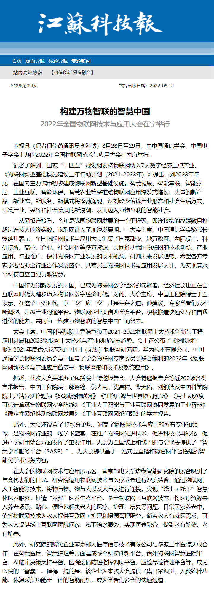 | 【江蘇科技報(bào)】構(gòu)建萬(wàn)物智聯(lián)的智慧中國(guó) 2022年全國(guó)物聯(lián)網(wǎng)技術(shù)與應(yīng)用大會(huì)在寧舉行 |