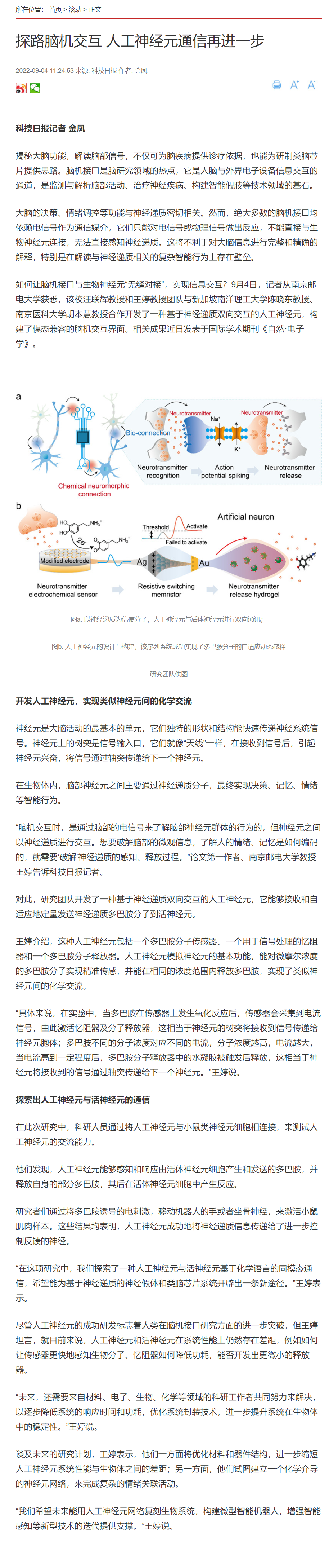 | 【中國科技網(wǎng)】探路腦機(jī)交互 人工神經(jīng)元通信再進(jìn)一步 |