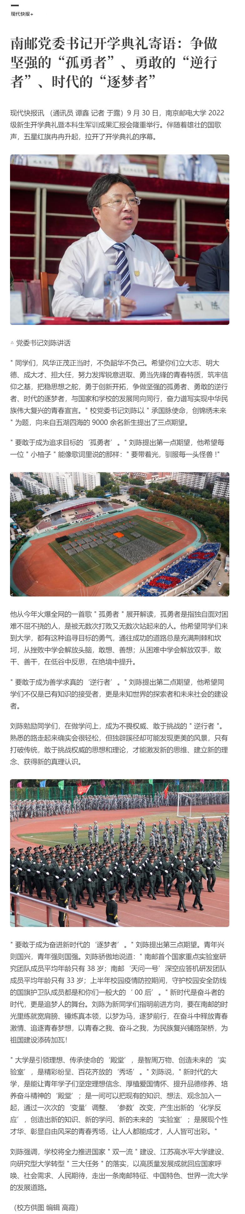 | 【現代快報全媒體】南郵黨委書記開學典禮寄語:爭做堅強的“孤勇者”、勇敢的“逆行者”、時代的“逐夢者” |