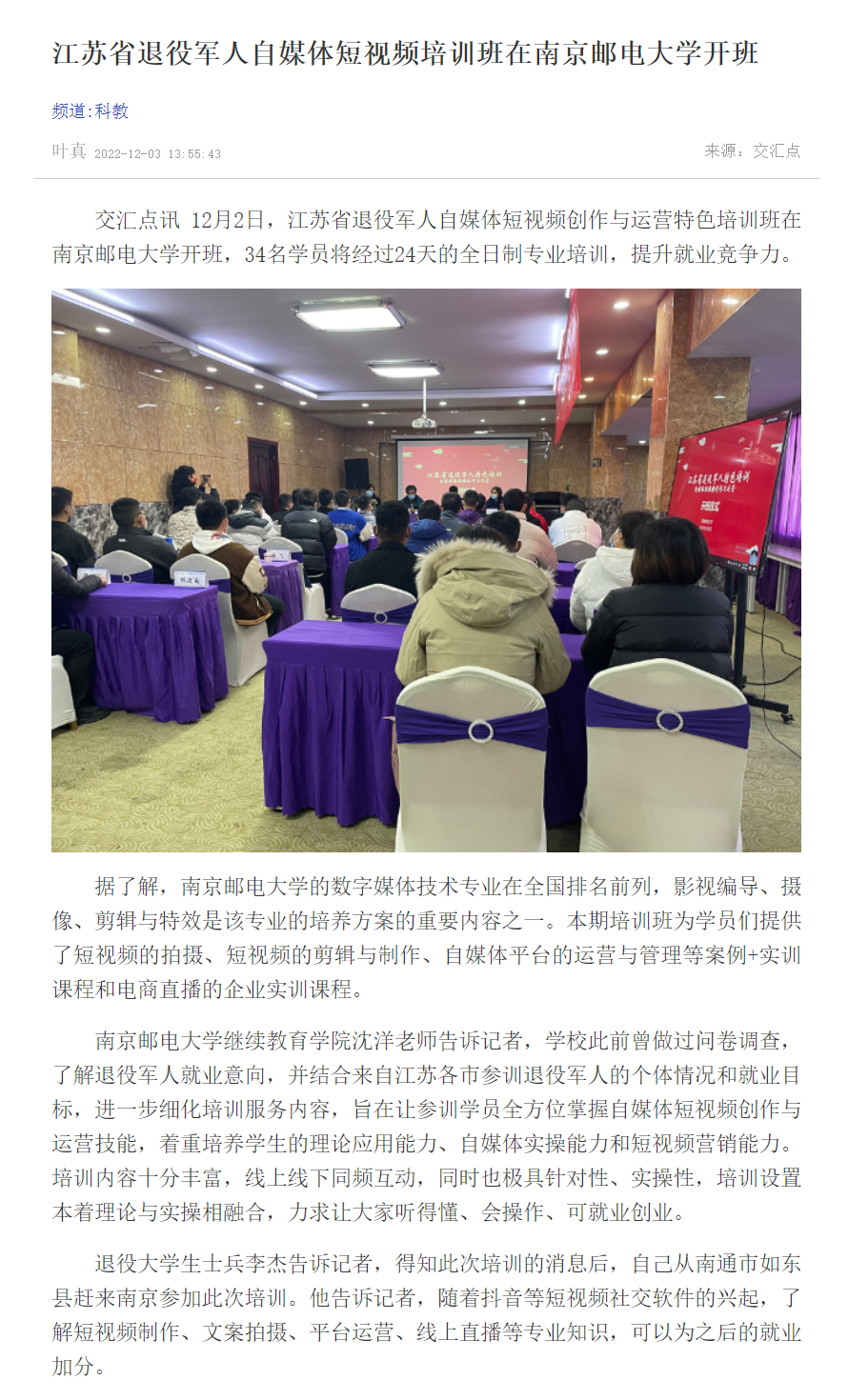 | 【新華日報客戶端】江蘇省退役軍人自媒體短視頻培訓班在南京郵電大學開班 |