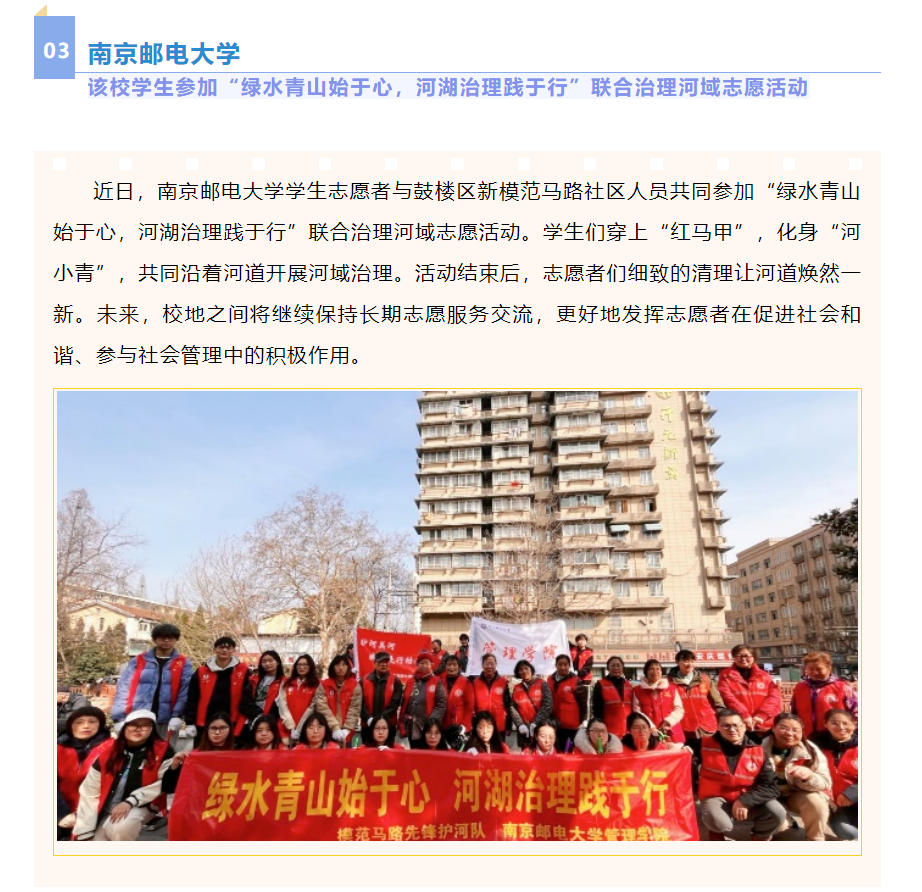 | 【省教育廳官微】南京郵電大學學生參加“綠水青山始于心,河湖治理踐于行”聯(lián)合治理河域志愿活動 |