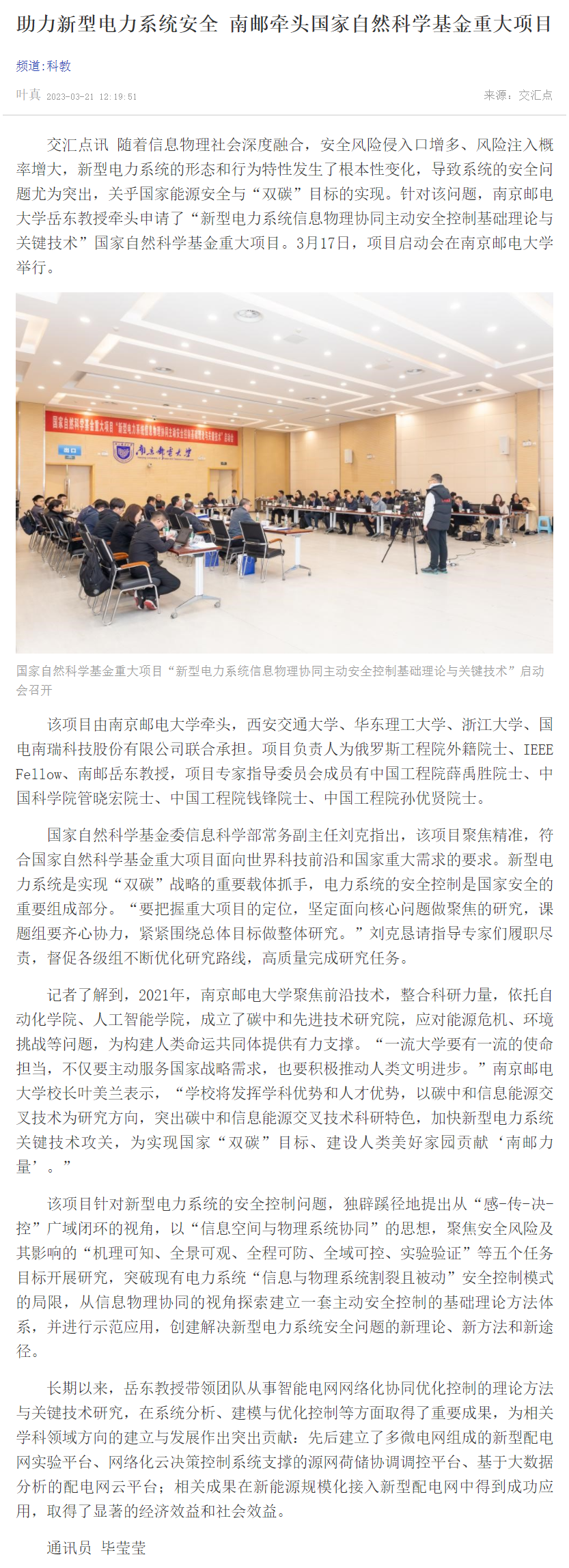 | 【新華日報客戶端】助力新型電力系統安全 南郵牽頭國家自然科學基金重大項目 |