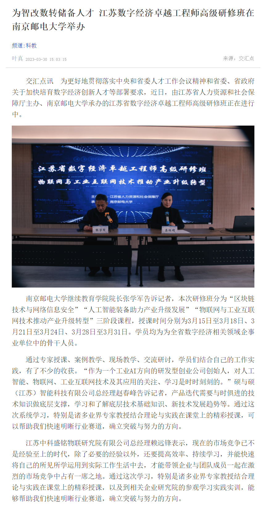 | 【新華日報客戶端】為智改數轉儲備人才 江蘇數字經濟卓越工程師高級研修班在南京郵電大學舉辦 |