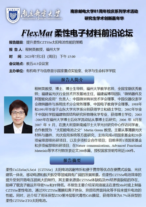 福州大學程樹英教授學術報告《提升柔性CZTSSe太陽電池性能的策略》