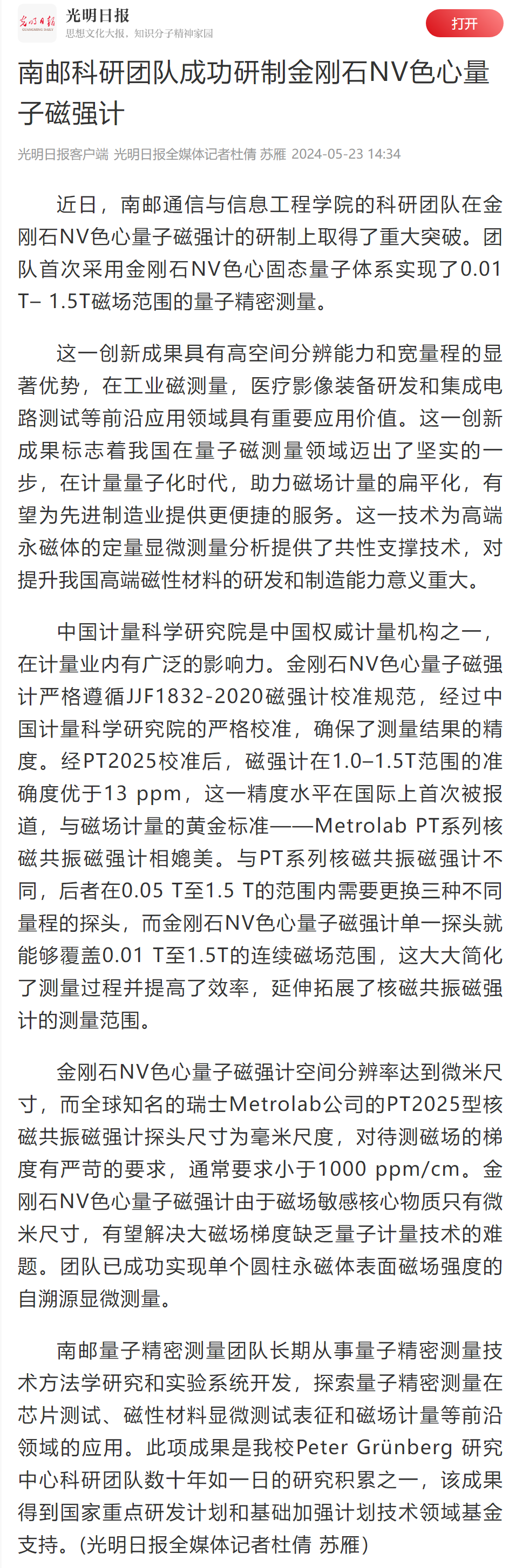 | 【光明日報客戶端】南郵科研團隊成功研制金剛石NV色心量子磁強計 |