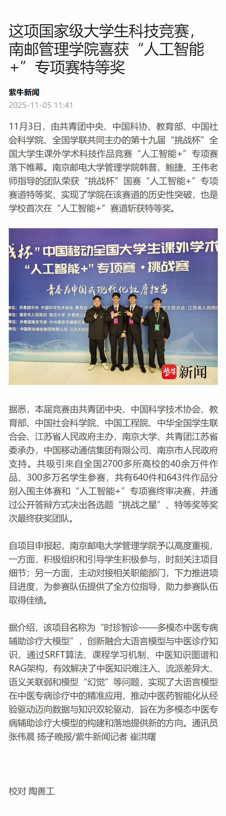 | 【揚子晚報客戶端】這項國家級大學生科技競賽,南郵管理學院喜獲“人工智能+”專項賽特等獎 |