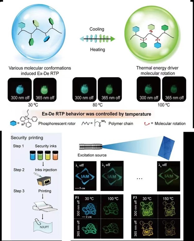 Aiming at this key scientific problem, the team led by Academician Huang Wei, Professor Zhao Qiang and Professor Ma Yun copolymerized the phosphorescent molecular rotor with acrylamide as monomer and developed a series of organic room temperature phosphorescent polymers. Because the aromatic groups on the phosphorescent molecular rotor can rotate freely, they will present different molecular structures in the polymer, which directly affects the triplet excited state properties of each phosphorescent monomer. Therefore, the prepared organic room temperature phosphorescent polymers show different phosphorescent colors under different wavelength excitation. Furthermore, the molecular structure of phosphorescent monomer can be changed by driving the molecular rotor to rotate through external thermal stimulation, and the response behavior of excitation wavelength-dependent luminescence can be changed, thus realizing dynamic regulation of response behavior. Finally, the team members explored the application of this kind of organic intelligent photoelectric materials in the field of optical information anti-counterfeiting. The research results have important guiding significance for the development of organic intelligent photoelectric materials whose response behavior can be dynamically regulated, and will also promote this kind of materials to make breakthrough progress in the photoelectric fields such as information display, information security and information sensing.