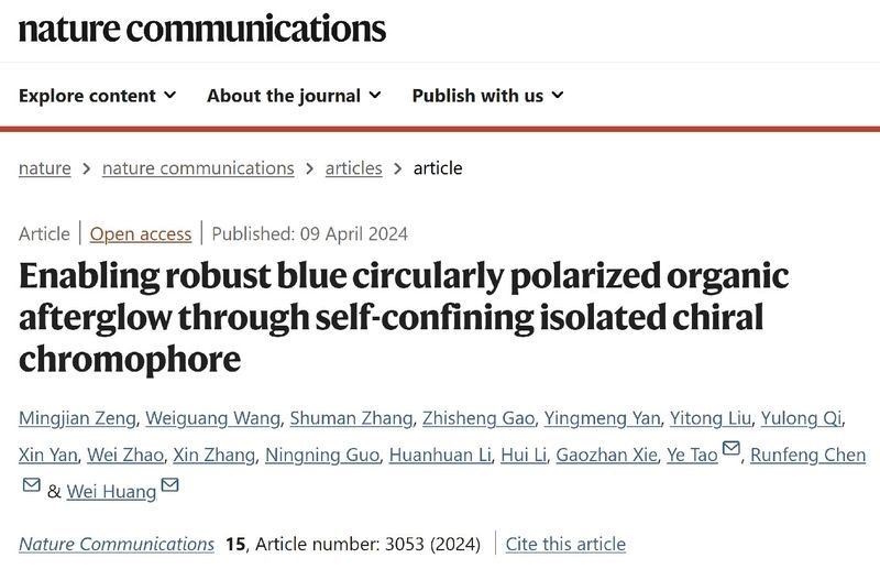 Nature Communications publishes research progress in the field of chiral organic afterglow by Prof. Tao Ye and Prof. Chen Runfeng from the team of Academician Wei Huang at the Key Laboratory of Organic Electronics and Information Display
