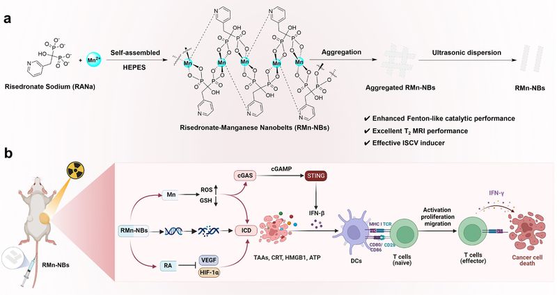 Radiation therapy-induced tumor damage can be viewed as a promising opportunity to establish endogenous in situ vaccines. However, the efficacy of in situ cancer vaccination (ISCV) induced by radiation therapy (RT) is very weak and often insufficient to elicit systemic anti-tumor immunity. Therefore, Prof. Lianhui Wang and Zhimin Luo's team develops two-dimensional risedronate-manganese nanobelts (RMn-NBs) based on the clinical osteoporosis drug (risedronate) and trace element (manganese ions) as an immunoadjuvant for radiotherapy, by using a drug self-assembly delivery strategy to enhance the tumor in situ vaccine effect induced by radiotherapy. RMn-NBs exhibit excellent T2 magnetic resonance imaging performance and enhanced Fenton-like catalytic activity, effectively inducing immunogenic cell death in tumor cells. Additionally, RMn-NBs significantly inhibit the HIF-1α/VEGF pathway, and activate the cGAS/STING pathway to promote the secretion of type I interferons, thereby strengthening the ISCV effect induced by radiotherapy and enhancing immune checkpoint blockade therapies for both primary and metastatic tumors. As a nanoadjuvant for radiotherapy, RMn-NBs demonstrate good biocompatibility and therapeutic efficacy, offering promising applications for cancer radiotherapy and immunotherapy.